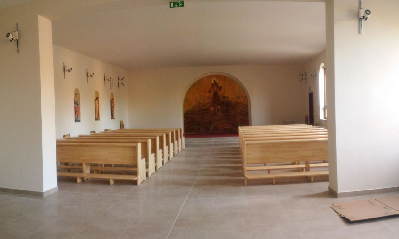 A templomtér feletti szinten klimatizált vendégszobák kerültek kialakításra.