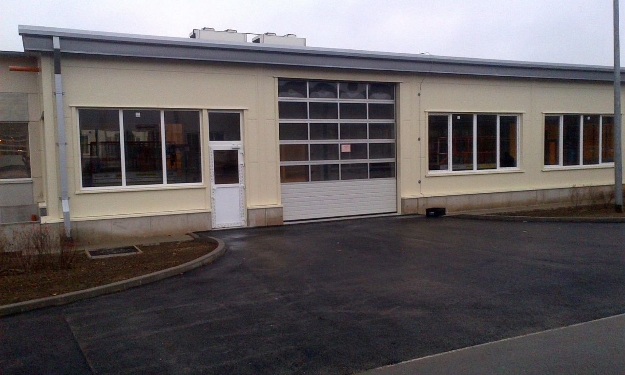 Acél vázszerkezetű dokkoló épület egy kamion fogadására alkalmas dokkoló állással.